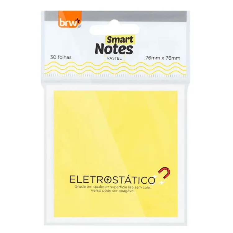Notas eletrostáticas BRW Smart Notes, tamanho 76x76mm, cores pastel sortidas, com 30 folhas. Fixação por carga eletrostática, sem uso de cola, permitindo reposicionamento sem resíduos. Ideais para lembretes, avisos temporários e organização em superfícies lisas como papel, vidro e plástico. Produto prático e reutilizável para papelaria.